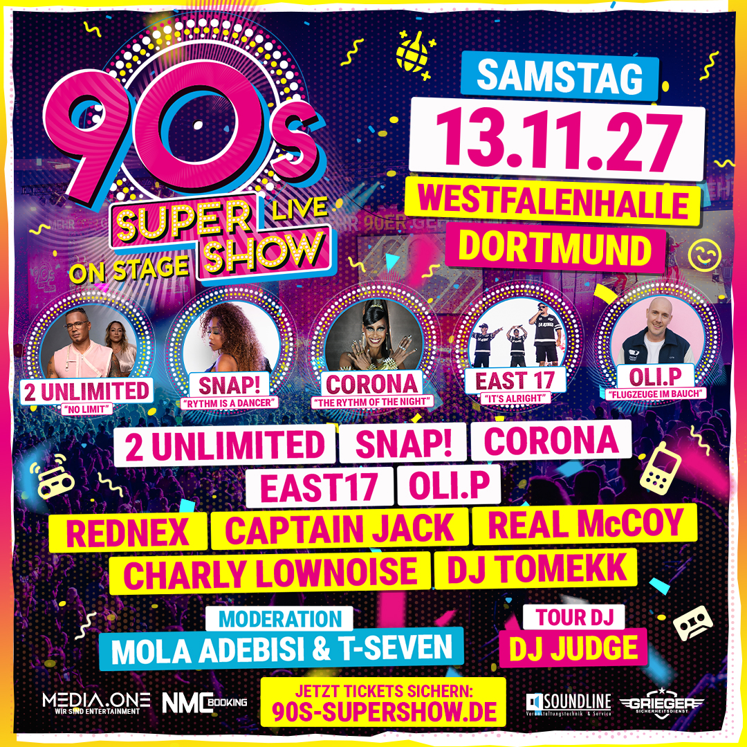 2027 ist es wieder soweit: Die 90s Super Show entert die Metropole im Herzen des Ruhrgebiets. Wir feiern in der Westfalenhalle Dortmund die größte 90er Party im Ruhrgebiet. Erlebt die Stars der 90er live auf der Bühne und feiert bei Europas 90er Party der Superlative in Dortmund. Sichert euch gleich euer Ticket für die Zeitreise in die Neunziger in der Westfalenhalle Dortmund!