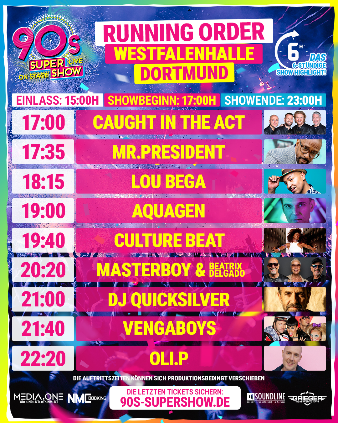 2026 ist es wieder soweit: Die 90s Super Show entert die Metropole im Herzen des Ruhrgebiets. Wir feiern in der Westfalenhalle Dortmund die größte 90er Party im Ruhrgebiet. Erlebt die Stars der 90er live auf der Bühne und feiert bei Europas 90er Party der Superlative in Dortmund. Sichert euch gleich euer Ticket für die Zeitreise in die Neunziger in der Westfalenhalle Dortmund!