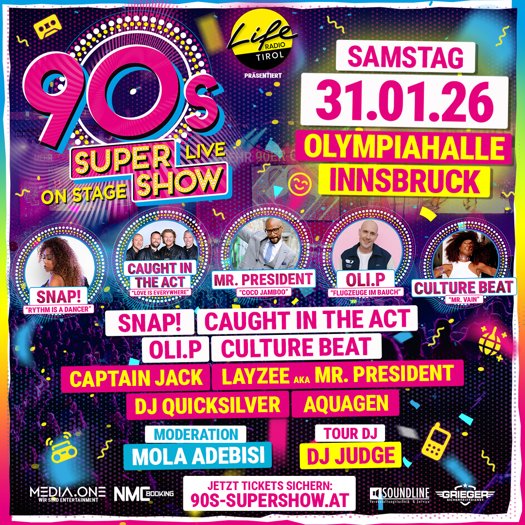 Die große 90er Party in Innsbruck! 2026 ist es soweit: Die 90s Super Show kommt nach Tirol. Wir feiern die größte 90er Party Tirols in der Olympiahalle Innsbruck. Sichert euch gleich euer Ticket für die Zeitreise in die Neunziger in Innsbruck!